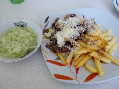 Na oleji jsem opekla játra nakrájená na kousky, posypala jsem je paprikou, trochou grilovacího koření a ještě jsem tam přidala malinko koření na kuře. Po chvíli žampiony, nakrájené na plátky (asi polovina hmotnosti jater) a asi deset minut jsem to dusila pod pokličkou. Pak jsem do směsi vmíchala trochu hotové jíšky, aby to bylo trošku jako omáčka, ne jen šťáva. Nahoře jsem to posypala strouhaným sýrem a trochu přisolila. K tomu okurkový salát a manžel si docela pomlaskával. Hranolky nebyly vůbec mastné, tak to nemělo chybu.