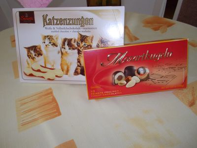 a přidal něco sladkého. Ví, že Mozartovy koule mám ráda a kočičí jazýčky kupuji všem okolo, ale sama jsem je ještě neochutnala.