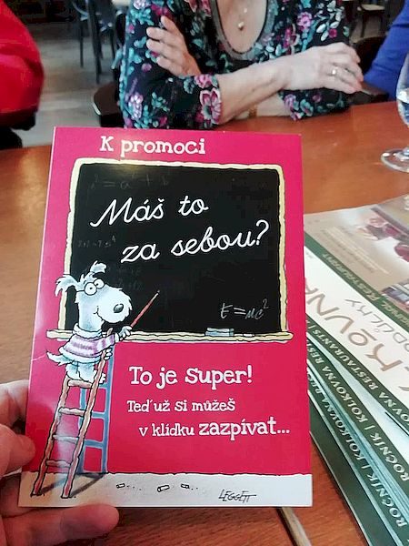 Dary a přání jsme Lukymu předali, ale toto přání je specifické, dostal ho od maminky jeho dívky a mne to tedy úplně dostalo. Po otevření přání totiž spustila písnička od známé skupiny, která se mi moc líbí – začíná – Promovaní inženýři. Když jsme měli skleničky v ruce, že připijeme Lukymu na zdraví, půjčila jsem si tohle přání a otřevřela. Zahráli jsme si k přípitku a hned nám bylo všem moc dobře.